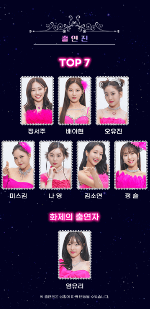 정서주, 배야현, 오유진, 미스김, 나영, 김소연, 정솔 7명 애 화제의 인물 엄뮤리를 포함해서 8명이서 공연합니다.