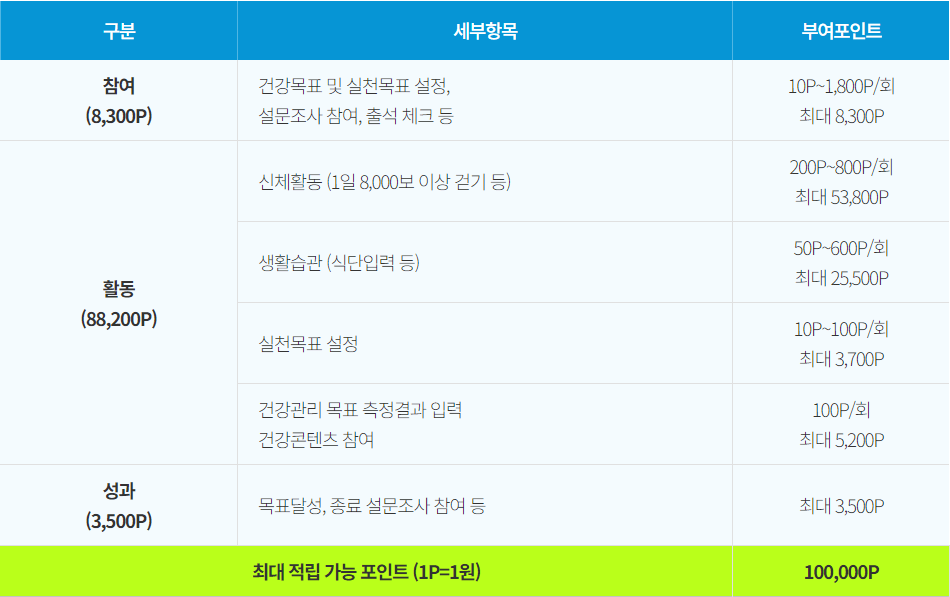 ○ 제공혜택 : 걷기, 건강카드, 식단관리 등 미션달성 시 최대 10만 포인트 제공(서울페이로 전환·사용)