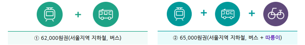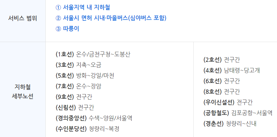 이용범위: 서울지역 지하철, 서울시 면허 시내·마을버스, 따릉이
