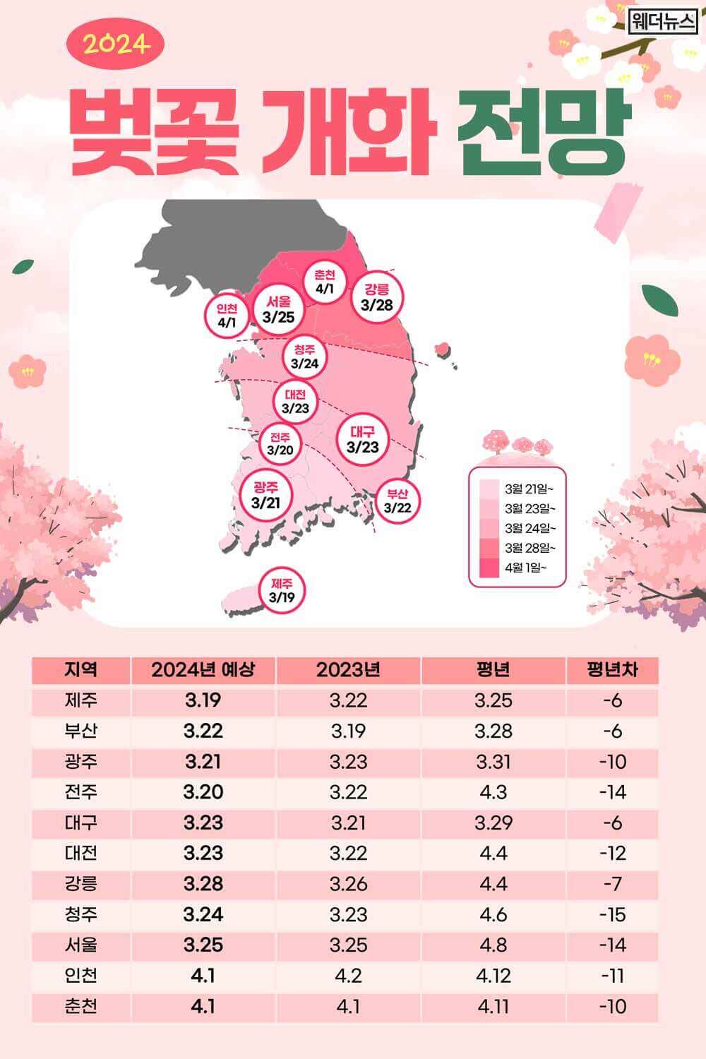 2024년 국내 벚꽃 화시기는 3/20일로 제주도가 가장 먼저 시작될 것이라고 예측되었습니다. 벚꽃 개화시기는 제주도를 먼저로 시작해서 3/21일 전주 3/22일 부산,대전,대구 순으로 개화가 시작될 것으로 보입니다.
