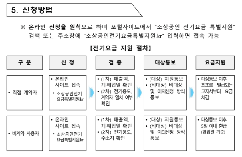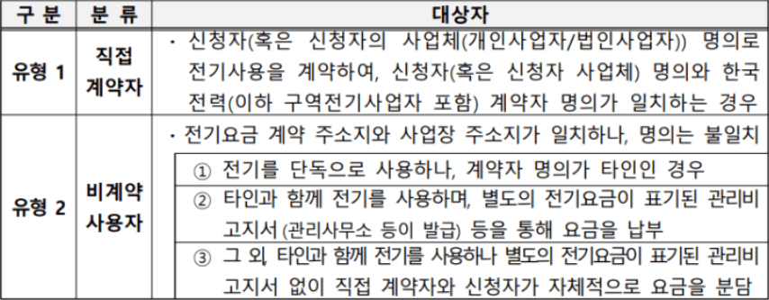 직접계약자 신청자 및 사업체의 명의로 전기사용을 하고 있으며, 신청자 명의와 한국 전력 계약자 명의가 일치하는 경우에 해당합니다. 이 경우에는 한전에서 계약자 DB를 보유하고 있고 매월 전기 사용량 확인 및 요금 청구 등 관리가 가능한 상태로 별도 서류 없이 신청자 정보만 입력하여 신청합니다. 대상자 통보 후 최초로 발행되는 전기요금 고지서상 요금으로부터 최대 20만 원까지 차감됩니다.
