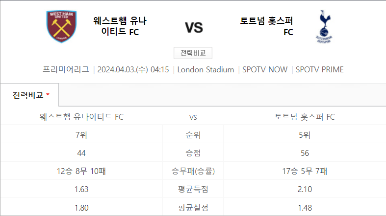 토트넘 VS 웨스트햄 경기 일정은 4월 3일 수요일 새벽 4시 15분 웨스트햄 홈구장인 런던 스타디움에서 경기가 펼쳐집니다.